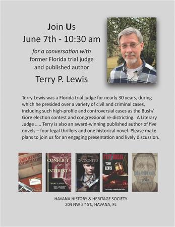 Join us June 7th at 10:30 am for a conversation with former Florida trial judge and published author Terry P. Lewis in the Conference Room at the Shade Tobacco Museum, 204 2nd Street NW, Havana, FL 32333