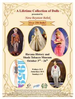 A Lifetime Collection of Dolls presented by Nora Boynton Bobek Over 250 Dolls! Havana History and Shade Tobacco Museum, October 3rd - 26th Fridays 11 - 3Saturdays 10 - 5Sundays 1 - 5